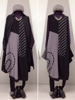 落ち感のあるジャンスカです。ストライプ柄の切替と渦巻きがポイントです。無地のサルエルパンツ着用で暖かく。新柄のレギンスも入荷しました。