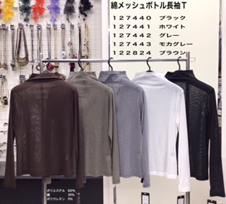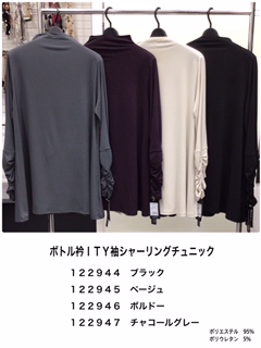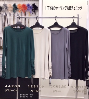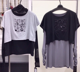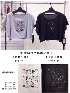 重ね着に重宝しそうな切抜貼り付ミニTです。つるっとした生地のインナーと合わせています。チュニックは丸首・ボトル衿がございます。