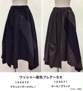 配色フレアースカート再入荷(124473ブラック、124474カーキへ品番変更)です。
