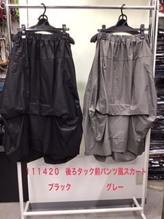 衿ギャザーが特長のベストとタックが特長のパンツ風スカートいかがでしょうか?
